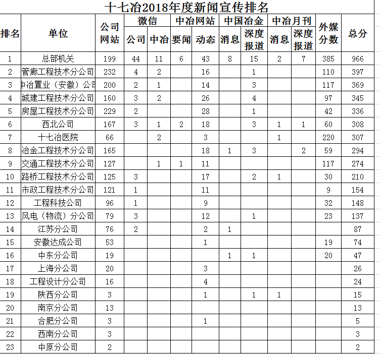 十七冶2018年度新聞宣傳排名