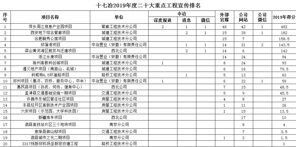 十七冶2019年度二十大重點工程宣傳排名