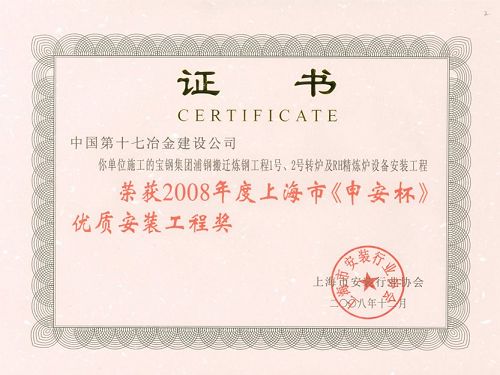 日前,在上海市安裝協會舉行的“上海市優質安裝工程頒獎大會”上,由中國十七冶承建的寶鋼集團浦鋼搬遷煉鋼工程1#、2#轉爐及RH精煉爐設備安裝工程榮獲2008年上海市《申安杯》優質安裝工程獎,這也是十七冶繼寶鋼集團股份公司不銹鋼工程之后又一次捧回的獎項。