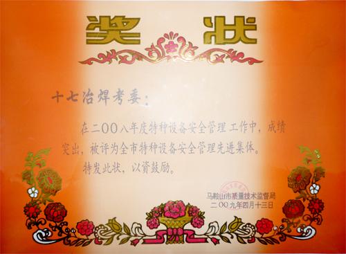 在日前召開的馬鞍山市2009年特種設備安全監督工作會議上,十七冶焊考委榮獲“馬鞍山市特種設備安全管理先進單位”稱號,受到市質量技術監督局的表彰。
