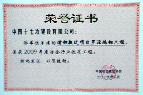 由中國十七冶承建的寶鋼集團浦鋼搬遷煉鋼工程在中國冶金建設協會評獎中,被評為“2009年度冶金行業優質工程”。這是該項工程繼榮獲“全國優秀焊接工程”、上海市“申安杯”、“金鋼一等獎”之后,又一次獲得的獎項,為浦鋼工程再添新的光彩。