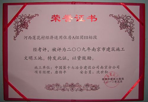 從南京市建筑工程局獲悉,十七冶南京分公司河西蓮花村經(jīng)濟(jì)適用房A組團(tuán)Ⅲ標(biāo)段獲得南京市2009年“建筑施工文明工地”榮譽(yù)稱(chēng)號(hào)。