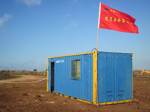 項目部在抓施工進度的同時,對施工安全更是常抓不懈。施工2區和施工6區里兩面鮮紅的旗幟迎風飄揚,上面寫著“中國十七冶青年黨員安全監督崗”。這是項目部為了發揮青年黨員的模范帶頭作用,牢固樹立安全第一的思想而特意設立的流動崗,項目部汪兵部長說:我們十分重視施工安全。從對施工人員進場前的三級教育,到進場車輛定期進行安全隱患排查、道路上設置交通協管員等等,確保這個項目安全無事故。