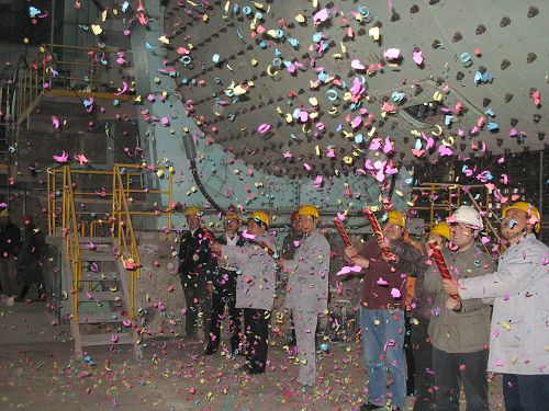 試投產儀式上,在一陣禮炮聲中泰州楊灣海螺公司總經理吳維國和項目經理吳德學一起按動電鈕,該工程第一臺磨徐徐轉動起來,標志著整個項目部施工生產的又一重要節點的完成。