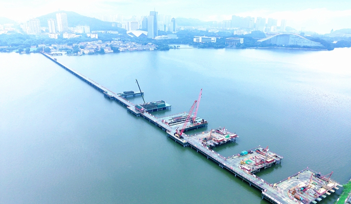 黃石段生態(tài)環(huán)境導(dǎo)向開發(fā)(EOD)項(xiàng)目涉及綠色產(chǎn)業(yè)3個,市政環(huán)境改造工程6個。其中湖泊綜合治理工程中的磁湖綠色廊道工程是一項(xiàng)重要內(nèi)容。該項(xiàng)目起于蘇州路與桂林南路交叉口,向東設(shè)置橋梁跨越磁湖后在建磁湖通道延伸線,全長約1.5千米,跨磁湖大橋全長846米,大橋按照中國傳統(tǒng)拱橋風(fēng)格設(shè)計為空腹式拱疊拱橋,共17個主拱,主拱圈拱腳位于水面之上。項(xiàng)目團(tuán)隊(duì)在制定施工方案時,分析了傳統(tǒng)技術(shù),采用滿堂支架搭設(shè),不僅安全風(fēng)險大,且拱腳處支架受空間限制,后期無法拔出。項(xiàng)目團(tuán)隊(duì)為保證承臺及拱座施工質(zhì)量,思考再三,改變拱橋合龍段位置,選擇在拱腳前4.5米處合龍的思路,拱腳處支撐在合龍段強(qiáng)度達(dá)到設(shè)計強(qiáng)度后拆除,避免將大量建筑材料留在水體中帶來的二次污染。合龍段采用補(bǔ)償收縮混凝土,并提高一個標(biāo)號。為確保該方案的可行性,項(xiàng)目部提前對大橋結(jié)構(gòu)受力進(jìn)行驗(yàn)算,編制專項(xiàng)施工方案,并采用BIM技術(shù)模擬施工,為拱橋施工提供技術(shù)及安全保證。