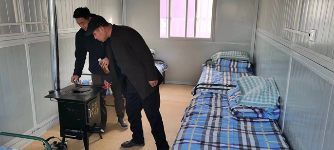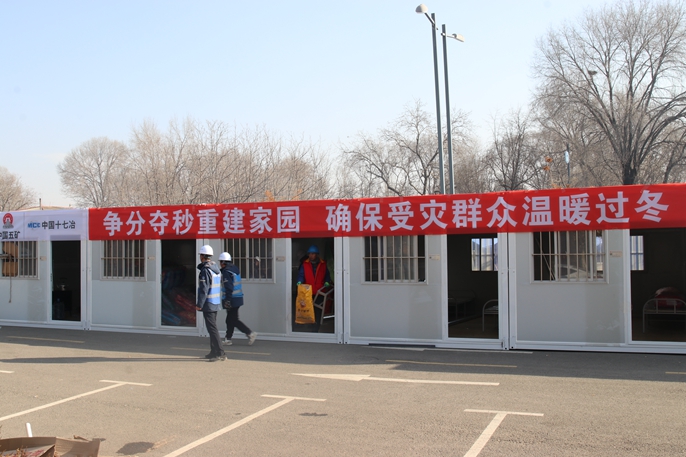 考慮到民和高寒氣候及物資緊缺情況下的群眾生活問題,中國十七冶在采購安裝活動板房的同時,第一批購置了取暖爐子100個、煤炭10噸和水壺100個、煤炭200袋、棉被30套、大衣70件及飲用水等生活物資物資,于21日20:30運抵民和縣。12月22日,工作隊又緊急采購了折疊床300件,棉被380件,床單、枕頭380套,臉盆200個,盆架100副,煙霧報警器100個,第二批救援物資于22日14:00運抵現場。23日下午15:00,工作隊在援建任務完成后,又將250袋面粉、100袋大米、400桶食用油等在內的第三批救援物資,全部捐贈給當地政府,并陸續發放給受災群眾使用。首批入住的村民已陸續搬進新家,在新房里溫暖過冬。