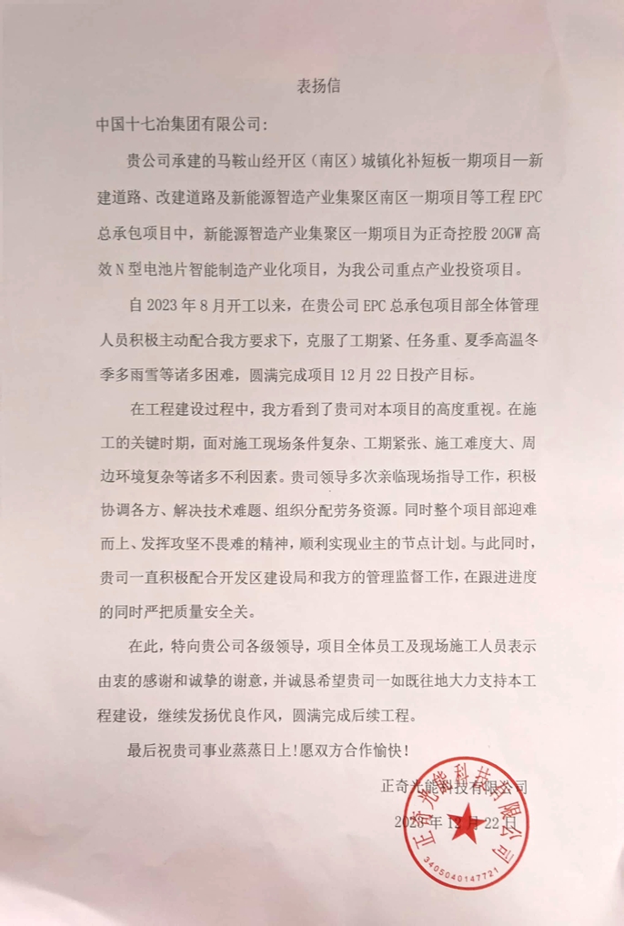 投產儀式上,正奇光能科技有限公司向中國十七冶授予“科學管理造精品工程,優質履約展央企風采”錦旗,并致表揚信。信中指出,工程建設過程中,項目團隊迎難而上,攻堅克難,在積極協調各方、解決技術難題、組織分配資源的同時積極配合開發區建設局與業主管理監督,嚴把質量安全關,打造精品工程。