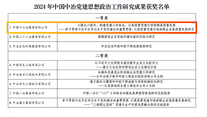 近日,中國(guó)十七冶接到中國(guó)中冶文件,公司黨建政研課題《六強(qiáng)化六提升,構(gòu)建黨建工作體系,以高質(zhì)量黨建引領(lǐng)保障高質(zhì)量發(fā)展》從38項(xiàng)成果中脫穎而出,榮獲中國(guó)中冶2024年黨建思想政治工作研究成果一等獎(jiǎng)第1名,下屬中冶華南申報(bào)的課題成果獲評(píng)優(yōu)秀獎(jiǎng)。同時(shí),公司作為第二課題組牽頭單位榮獲優(yōu)秀組織獎(jiǎng)。