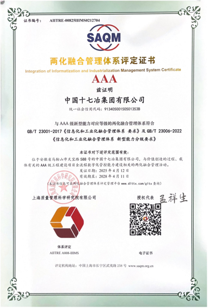 近日,中國十七冶順利通過國家工信部“兩化融合管理體系AAA級”再評定。自2022年首次獲得“兩化融合管理體系AAA級認定”以來,公司在信息化與工業化深度融合方面持續深耕,此次再評定的順利通過是對公司在信息化與工業化融合領域卓越實踐的再度認可,充分彰顯了公司在數字化建設進程中穩步向前的堅定步伐,為公司實現打造“全國一流、行業領先的工業化、數字化、綠色化、智能化建筑運營服務商”目標提供了有力支撐。