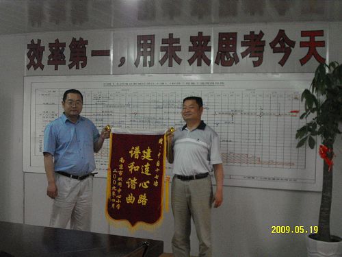 5月19日下午,南京市雙閘中心小學校長曹榮成等校領導來到十七冶南京濱江大道1.1標項目部,向十七冶南京濱江大道項目部贈送一面繡有“建連心路,譜和諧曲”八個金色大字的錦旗,并代表全校二千名師生向項目部一年來對該校師生各方面的關心、幫助表示感謝!