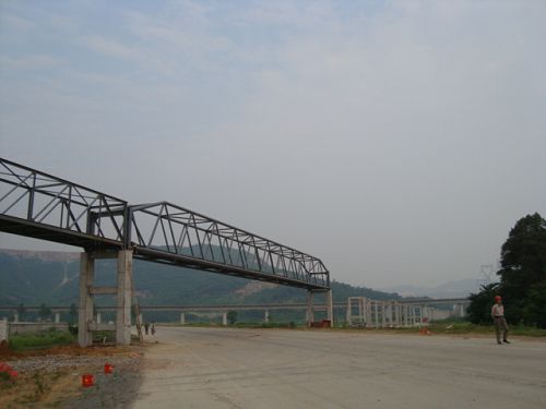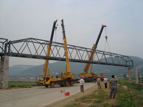 此次跨鋼桁架跨度55.5m,為鋼管構(gòu)件,重量約53t,兩端為砼支架,跨越沿新公路,吊裝難度較大。此段廊道跨越已經(jīng)通車(chē)的公路且車(chē)流量較大,在吊裝前由交通管理部門(mén),在道路兩端設(shè)置告示牌,并由交警部門(mén)進(jìn)行交通管制,道路全封閉,為確保成功吊裝,該項(xiàng)目部?jī)?yōu)化施工方案,采用一臺(tái)70t、兩臺(tái)25t抬吊,相互配合,確保了該鋼桁架一次就位成功。