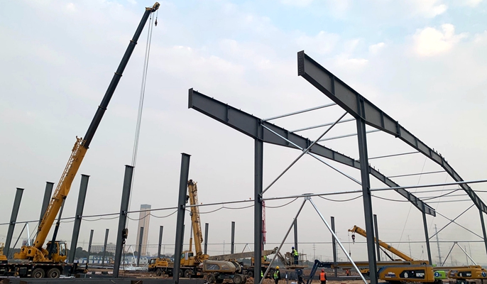 本項目占地面積約627.2畝,業主單位要求1年實現首座窯爐點火運行,工程量大且工期緊。開工以來,項目部科學安排施工,始終嚴抓安全、質量和環保管控,確保工程穩步推進。在吊裝過程中,管理人員深入一線,對鋼結構制作、運輸形變、吊裝模擬等全過程精細化管控,在4臺汽車吊和4輛登高車的配合下,克服單梁跨度大(46米)等不利因素,順利完成了既定作業目標。