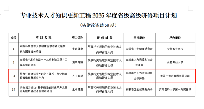 近日,安徽省人力資源和社會保障廳下發了《關于印發專業技術人才知識更新工程2025年國家級和省級高級研修項目計劃的通知》(皖人社函〔2025〕225號),中國十七冶申報的《聚力打造建筑業“四化”體系,加快培育數智建造新質生產力》成功入選項目計劃,并獲得省級財政資助。