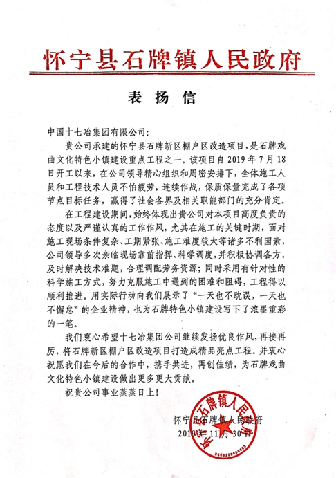 12月2日,中國十七冶集團收到安徽懷寧縣石牌鎮人民政府發來的表揚信,對房屋工程技術分公司項目管理團隊在懷寧縣石牌鎮棚戶區改造項目建設中,保質保量完成各項節點目標給予高度贊譽。