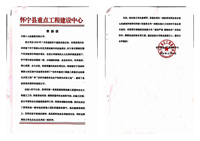 感謝信中指出,十七冶自進(jìn)入懷寧以來先后承建了懷寧縣新山社區(qū)及前進(jìn)城中村改造項(xiàng)目、懷寧縣石牌新區(qū)棚戶區(qū)改造項(xiàng)目等諸多項(xiàng)目,在公司領(lǐng)導(dǎo)的大力支持和高度重視下,懷寧項(xiàng)目部全員團(tuán)結(jié)一致,以飽滿的熱情,務(wù)實(shí)的作風(fēng),科學(xué)組織,精心部署,全力以赴,保質(zhì)保量地完成各項(xiàng)任務(wù)。特別是懷寧縣高河鎮(zhèn)新山社區(qū)城中村改造項(xiàng)目獲得了“安慶市建設(shè)工程施工質(zhì)量安全標(biāo)準(zhǔn)化示范工程”和“安慶市建筑安全生產(chǎn)標(biāo)準(zhǔn)化示范工地”,贏得了縣政府相關(guān)領(lǐng)導(dǎo)的高度認(rèn)可。
