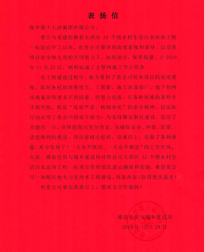 1月8日,河北省雄縣住房與城鄉(xiāng)建設(shè)局發(fā)來表揚(yáng)信,對中國十七冶集團(tuán)交通工程技術(shù)分公司承建的雄縣大清河32個傍水村生活污水治理項目順利完成主管網(wǎng)施工任務(wù)予以大加贊揚(yáng),對公司領(lǐng)導(dǎo)的高度重視及項目部全體人員的辛勤付出給予了充分肯定和認(rèn)可。
