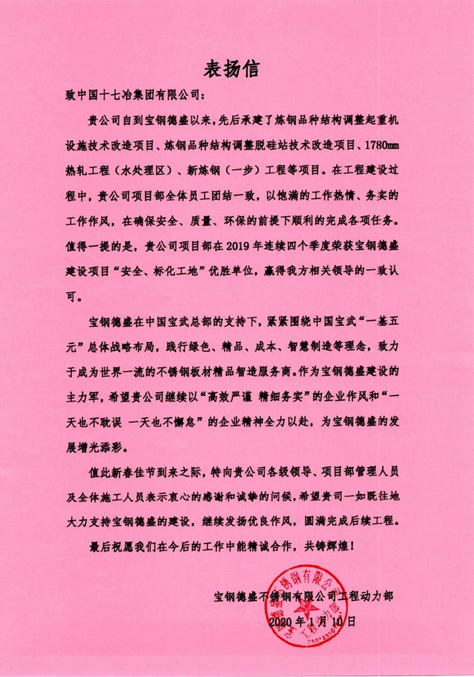 1月10日上午,中國十七冶集團收到了來自寶鋼德盛不銹鋼有限公司發來的表揚信。