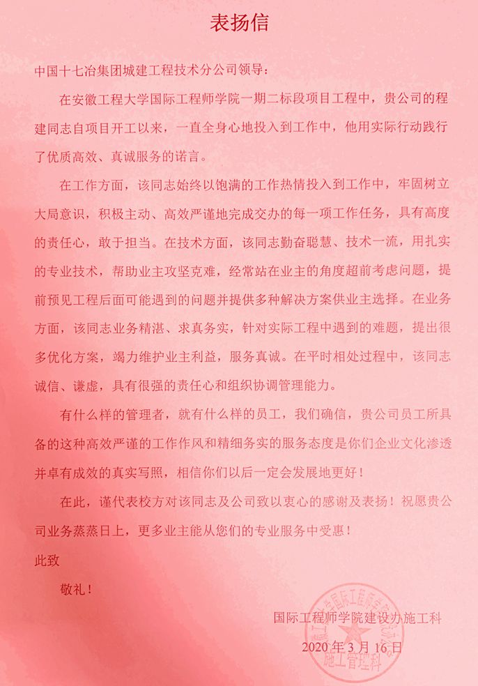 3月26日,中國十七冶集團城建工程技術分公司收到安徽工程大學國際工程師學院建設辦施工科發(fā)來的表揚信,表揚項目部程建同志工作積極主動,敢于擔當,高效嚴謹推進工程建設,贏得了各方認可。