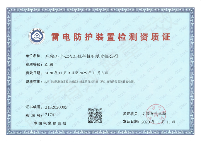 11月16日,十七冶工程科技公司獲批安徽省氣象局頒發的雷電防護裝置檢測乙級資質證書。