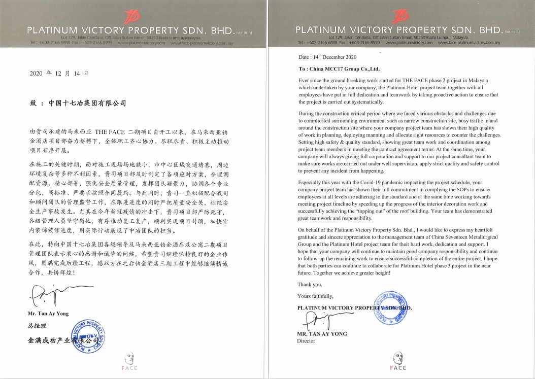 近日,馬來(lái)西亞金滿成功產(chǎn)業(yè)有限公司向中國(guó)十七冶集團(tuán)致表?yè)P(yáng)信,對(duì)房屋工程技術(shù)分公司馬來(lái)西亞吉隆坡鉑金酒店及公寓二期工程項(xiàng)目部取得的突出業(yè)績(jī)給予充分肯定,并提出表?yè)P(yáng)。