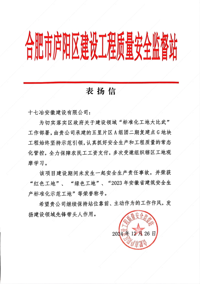 12月26日,合肥市廬陽區建設工程質量安全監督站向十七冶安徽建設有限公司致表揚信,對合肥五里片區A組團二期G地塊項目團隊精益管理,保障項目順利推進提出表揚。