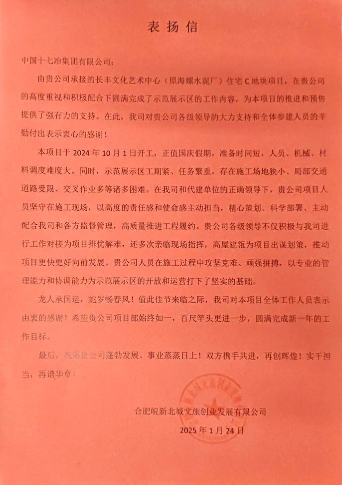 1月24日,合肥皖新北城文旅創業發展有限公司向中國十七冶集團致表揚信,對城建分公司長豐文化藝術中心片區城市更新(原海螺水泥廠)項目部在過去一年里搶抓實干,確保項目高品質履約表示感謝。