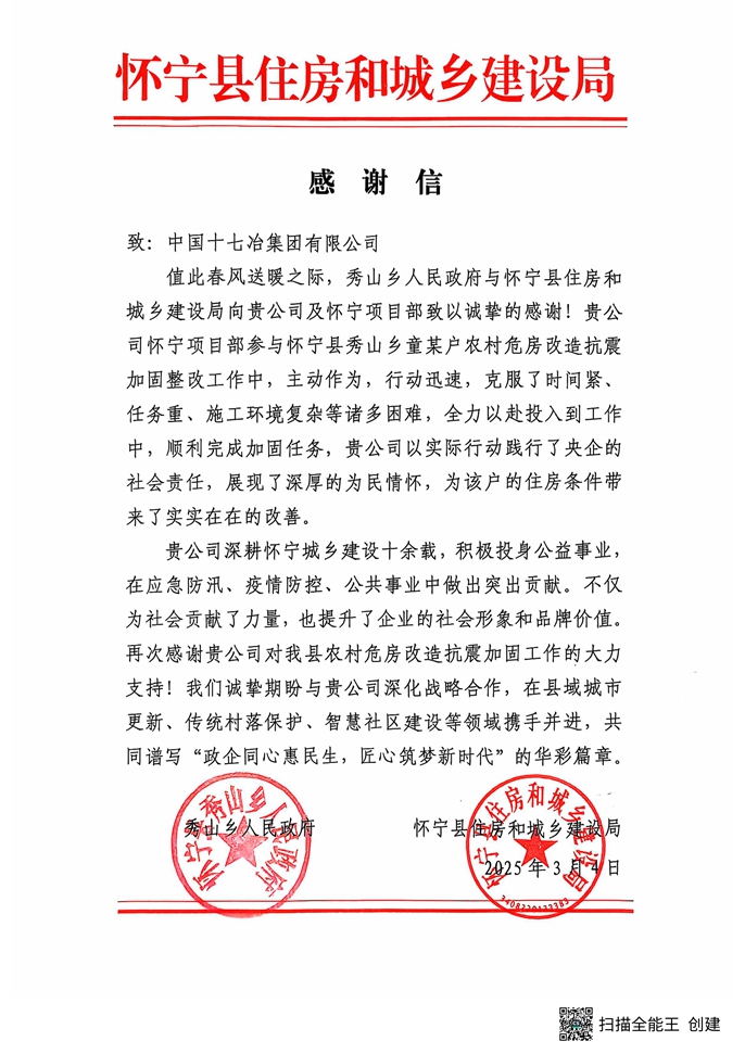 近日,安慶市懷寧縣住建局與秀山鄉(xiāng)人民政府向中國十七冶致感謝信,對(duì)懷寧項(xiàng)目部在農(nóng)村危房改造與抗震加固整改工作中做出的貢獻(xiàn)予以肯定與感謝。