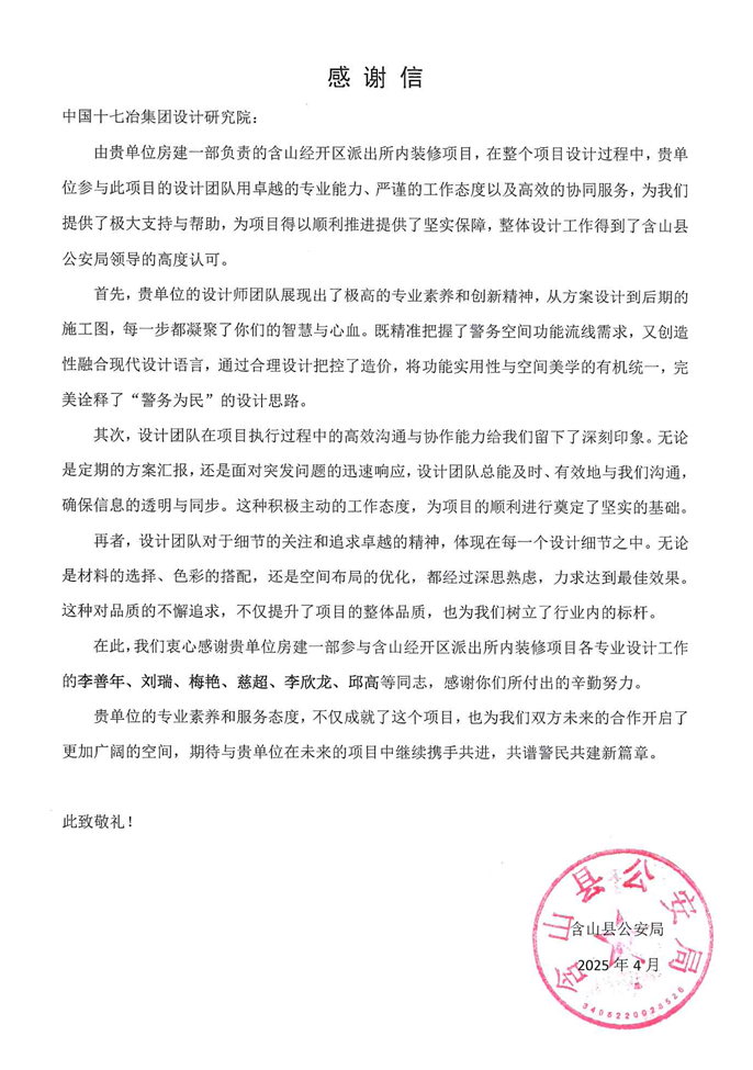 近日,馬鞍山市含山縣公安局向中國十七冶設(shè)計(jì)研究院致感謝信,對設(shè)計(jì)團(tuán)隊(duì)在含山經(jīng)開區(qū)派出所內(nèi)裝修項(xiàng)目工作中提供的優(yōu)質(zhì)設(shè)計(jì)服務(wù)予以肯定與感謝。