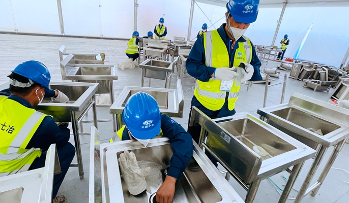 在細致研討施工圖紙并確定最佳施工方案后,16日晚11時,由住建分公司承擔的方艙水電暖通、公共衛浴設施及水電安裝施工開始進行大范圍作業,各水電班組充分發揮專業優勢,加快水電安裝,協助其他工種加快推進。現場每名員工都在超負荷運轉中。凌晨3時的大巴車上,大家抓緊寶貴的時間進行修整,凌晨5時許又相聚于施工現場,進行下一步任務……