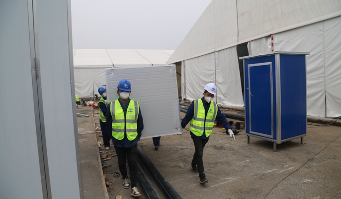 整個(gè)臨港方艙醫(yī)院總工期只有168小時(shí),留給援建團(tuán)隊(duì)的施工任務(wù)顯得極為艱巨。這支年齡雖小、但經(jīng)驗(yàn)豐富的青年生力軍配合組織參與方艙醫(yī)院生活設(shè)施區(qū)域水電安裝工作,不分晝夜,全程守在施工一線,爭(zhēng)分奪秒。在施工任務(wù)的生活洗漱區(qū)及方艙醫(yī)院內(nèi),一面面鮮紅的團(tuán)旗與黨旗立了起來,他們協(xié)助大部隊(duì)快速高效地進(jìn)行移動(dòng)廁所、淋浴間等施工作業(yè),協(xié)助搬運(yùn)安裝淋浴房96間、移動(dòng)廁所192間、排污泵28臺(tái)、一體化泵站14套、洗臉池96套、接地極62根,鋪設(shè)燈帶260米、橡膠地毯1620平方米,在公共區(qū)域還安裝了應(yīng)急燈12套,衛(wèi)浴間內(nèi)安裝照明燈具100套,在6天時(shí)間里完成了平常要一個(gè)月才能完成的水電安裝任務(wù),他們的努力獲得了一致好評(píng)。