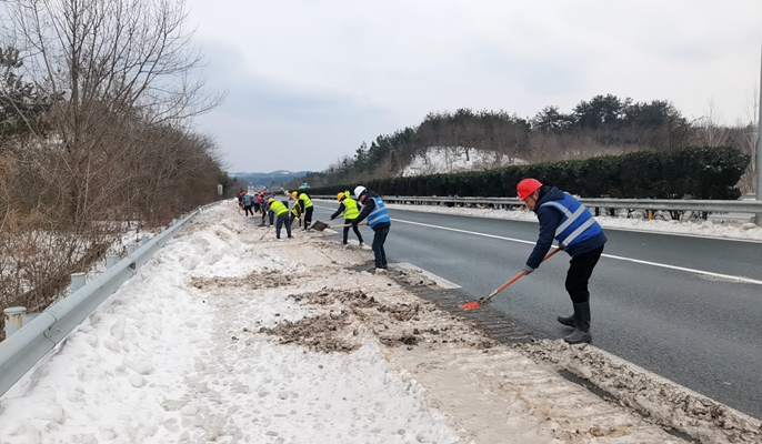 風(fēng)雪過(guò)后,路面打滑難行,許廣高速三陽(yáng)段積雪造成交通阻斷。2月22日上午,得知消息后,項(xiàng)目部迅速籌備3噸融雪劑,緊急組織60名管理、作業(yè)人員,8臺(tái)平地機(jī)、推土機(jī)、裝載機(jī)于中午12時(shí)抵達(dá)積雪路段,開(kāi)展路面清掃、撒鹽化雪、擺放警示標(biāo)識(shí)等作業(yè)。過(guò)程中,黨員干部與團(tuán)員青年齊心協(xié)力,對(duì)長(zhǎng)下坡、彎道等重要路段駐點(diǎn)巡查,排查安全隱患,努力將低溫雨雪天氣的不利影響降到最低。截至2月23日上午9時(shí),項(xiàng)目部已完成許廣高速三陽(yáng)段除雪破冰作業(yè)超15公里,作業(yè)還在持續(xù)推進(jìn)中。