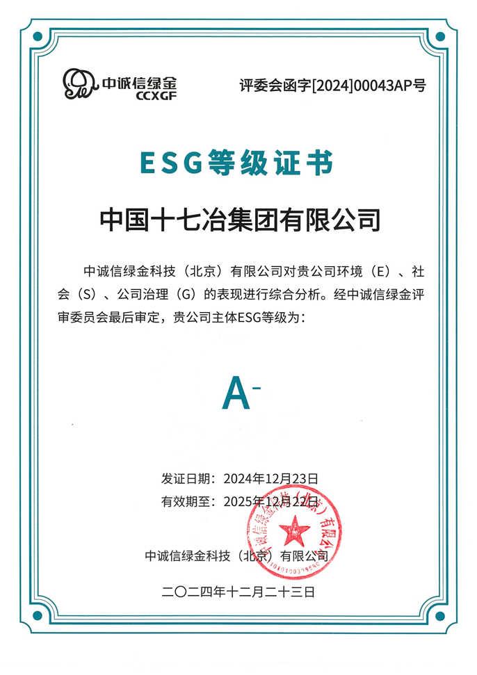 12月23日,中國十七冶獲得中誠信綠金ESG評級A-等級。公司首次參與ESG評級并斬獲A-等級的良好評定,為公司轉(zhuǎn)型升級實現(xiàn)高質(zhì)量發(fā)展提供了堅實有力的支撐。