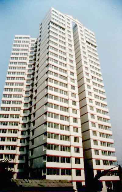 該工程高73.1米,地上24層,地下一層,建筑面積15800平方米,呈蝶形布置,中間為筒體結構的內廊,每層八戶二室一廳,鋼筋混凝土剪力墻結構,混凝土等級C40,工期18個月。工程施工結束時進行了檢測,上下偏差僅30mm,精度4/1000,裝修工程完全符合質量標準,實現了優質、安全、高效的目標,2000年被上海浦東建筑業協會評為“東方杯”、在上海浦東新區“世紀杯”優秀住宅評比中榮獲“創無質量通病成果獎”。
