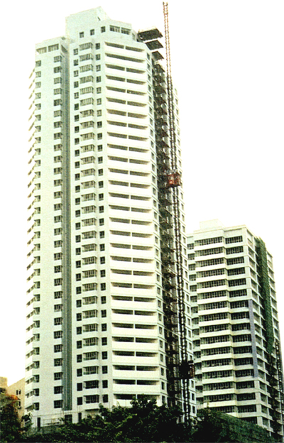 該工程為框架結構,由裙房及兩個塔樓組成,即公寓樓高39層(121m)、寫字樓高25層(78m)。總建筑面積63740m2,合同價14270萬元。該工程于1998年11月4日開工,2001年3月8日竣工,合同工期41個月,實際工期40個月,工程質量評定結果為優(yōu)良,受到社會各界的一致好評。