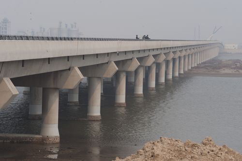 十七冶承建的天津?yàn)I海新區(qū)海景大道南延線工程獨(dú)流減河特大橋項(xiàng)目工程合同工期18個(gè)月。該橋全寬25m,橋梁全長(zhǎng)1084.66m,橋梁建筑面積約27116.5m。橋梁上、下行橋結(jié)構(gòu)分開,半幅橋梁寬度為12.5m。