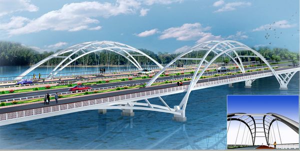 十七冶承建的馬鞍山江東大道三期陽湖塘大橋工程位于佳山鄉以南,梅山北側,擬建于規劃中的梅山公園--陽湖塘水域。大橋全長198米,總寬度61.3米。采用月牙型鋼拱橋+連續箱梁結構,全橋分為相對獨立的四座橋。其中中橋、邊橋各為兩座。中橋采用預應力混凝土連續現澆箱梁結構,跨徑布置為24+5*30+24m,雙向六車道,供機動車輛行駛。邊橋采用月牙型鋼拱橋,跨徑布置為24+30+90+30+24m,最大跨徑為90m,造型輕盈美觀,供行人和非機動車使用。該工程榮獲2012年度安徽省省優“黃山杯”。