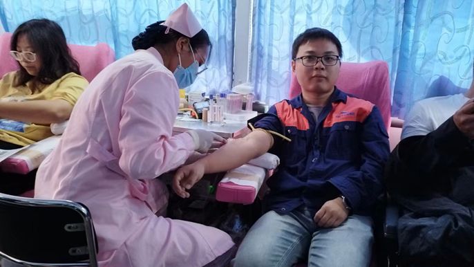 在現場醫護人員的引導下,項目青年員工有序按照掃碼填表、健康征詢、測量血壓、采血化驗等流程做好獻血準備工作。初篩檢查合格的獻血者們陸續登上獻血車,配合醫護人員進行血液采集。大家挽起衣袖,伸出胳膊,不一會兒超1000毫升血液緩緩匯入儲血袋,匯聚成愛的暖流,為緩解馬鞍山血液緊缺的現狀貢獻了自己的力量。