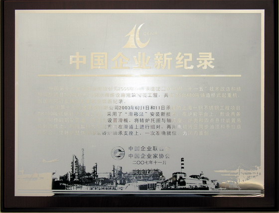 這四項“中國企業新紀錄”是:十七冶20061222日承建竣工的馬鋼新區“十一五”技術改造與結構調整項目300噸轉爐與鋼水精煉設施工程,利用480噸橋式起重機、卷揚機和滑輪組等安裝工具,將組裝好的總量692噸的轉爐本體三大件,一次整體移動到位,其中最快一臺僅用38分鐘,創國內同行業轉爐移動最快新紀錄。