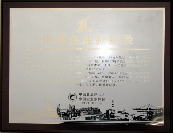 十七冶有限公司創出四項“中國企業新紀錄”, 日前獲得中國企業聯合會、中國企業家協會頒發的“中國企業新紀錄”牌匾。