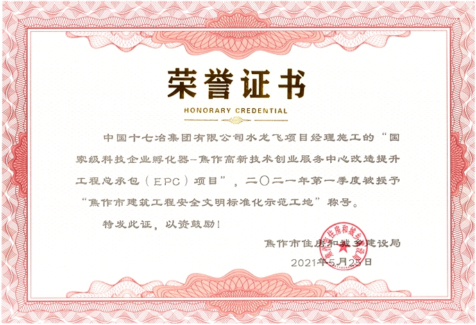6月1日,中冶置業(yè)(安徽)公司承建的河南焦作高新技術(shù)創(chuàng)業(yè)服務(wù)中心改造提升工程項(xiàng)目被評為“焦作市建筑工程安全文明標(biāo)準(zhǔn)化示范工地”。