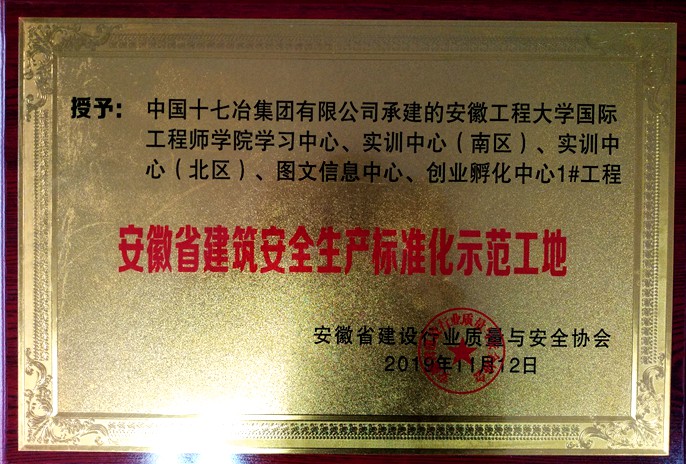 12月15日,由中國十七冶集團城建工程技術分公司承建的安徽工程大學項目順利獲得“安徽省建筑安全生產(chǎn)標準化示范工地”稱號。