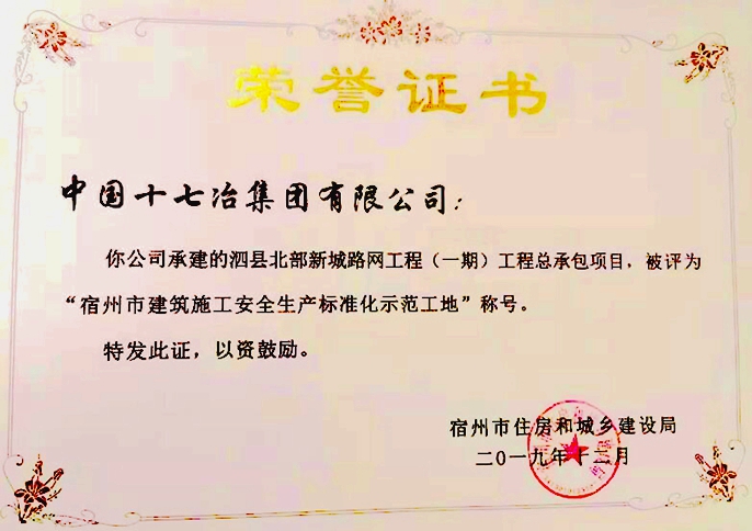 12月20日,從宿州市住房和城鄉建設局獲悉,中國十七冶集團路橋工程技術分公司泗縣北部新城路網工程(一期)項目榮獲“宿州市建筑施工安全生產標準化示范工地”稱號。