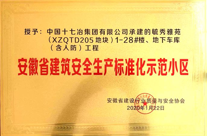 413日,中國十七冶集團(tuán)合肥毓秀雅苑項(xiàng)目收到安徽省建設(shè)行業(yè)質(zhì)量與安全協(xié)會頒發(fā)的“安徽省建筑安全生產(chǎn)標(biāo)準(zhǔn)化示范小區(qū)”榮譽(yù)證書。